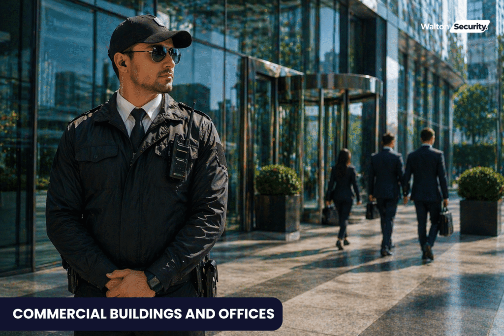 Corporate offices, business parks, and mixed-use buildings. These sites typically need visitor control, building entrance management, after-hours access checks, and professional front-of-house guarding.