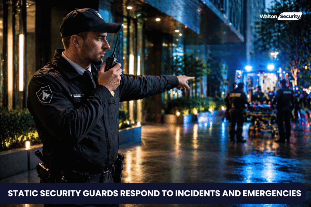 Static guards guide first responders including police, ambulance, and fire services to incident locations upon arrival. Guards provide situational briefings, unlock access points, and assist emergency personnel as directed. Post-incident duties include securing affected areas, preserving evidence, and completing detailed incident documentation for management review and insurance purposes.