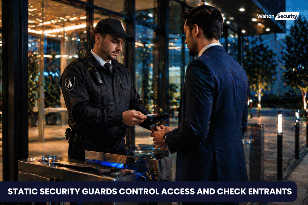 Static guards manage entry and exit points by verifying visitor credentials, checking identification documents, and screening entrants against authorised access lists. Access control duties include issuing visitor passes, logging arrivals and departures in visitor databases, and ensuring all persons entering restricted areas have proper authorisation. Guards position themselves at gatehouses, reception desks, and building entrances where they can observe and intercept all incoming traffic.